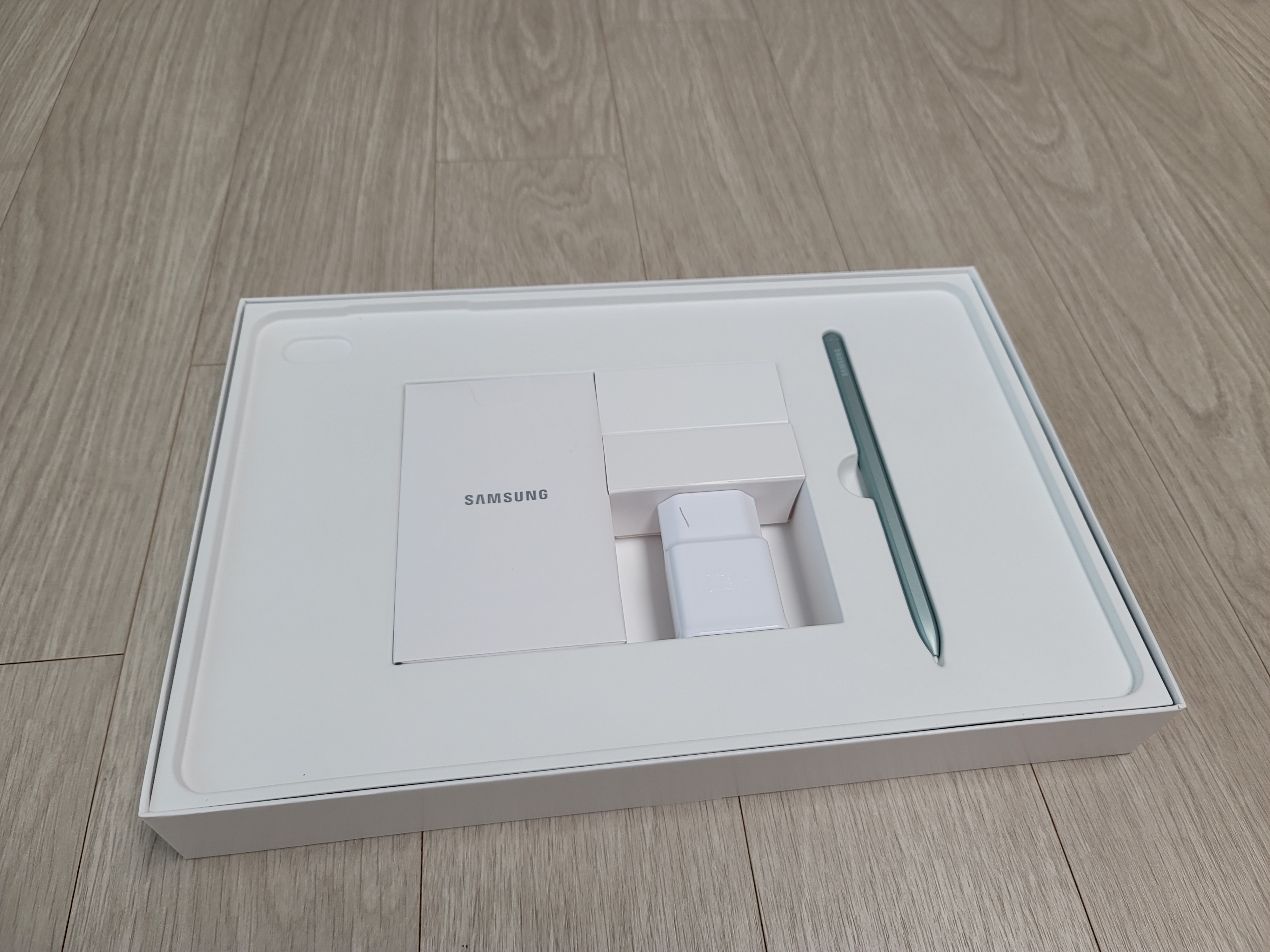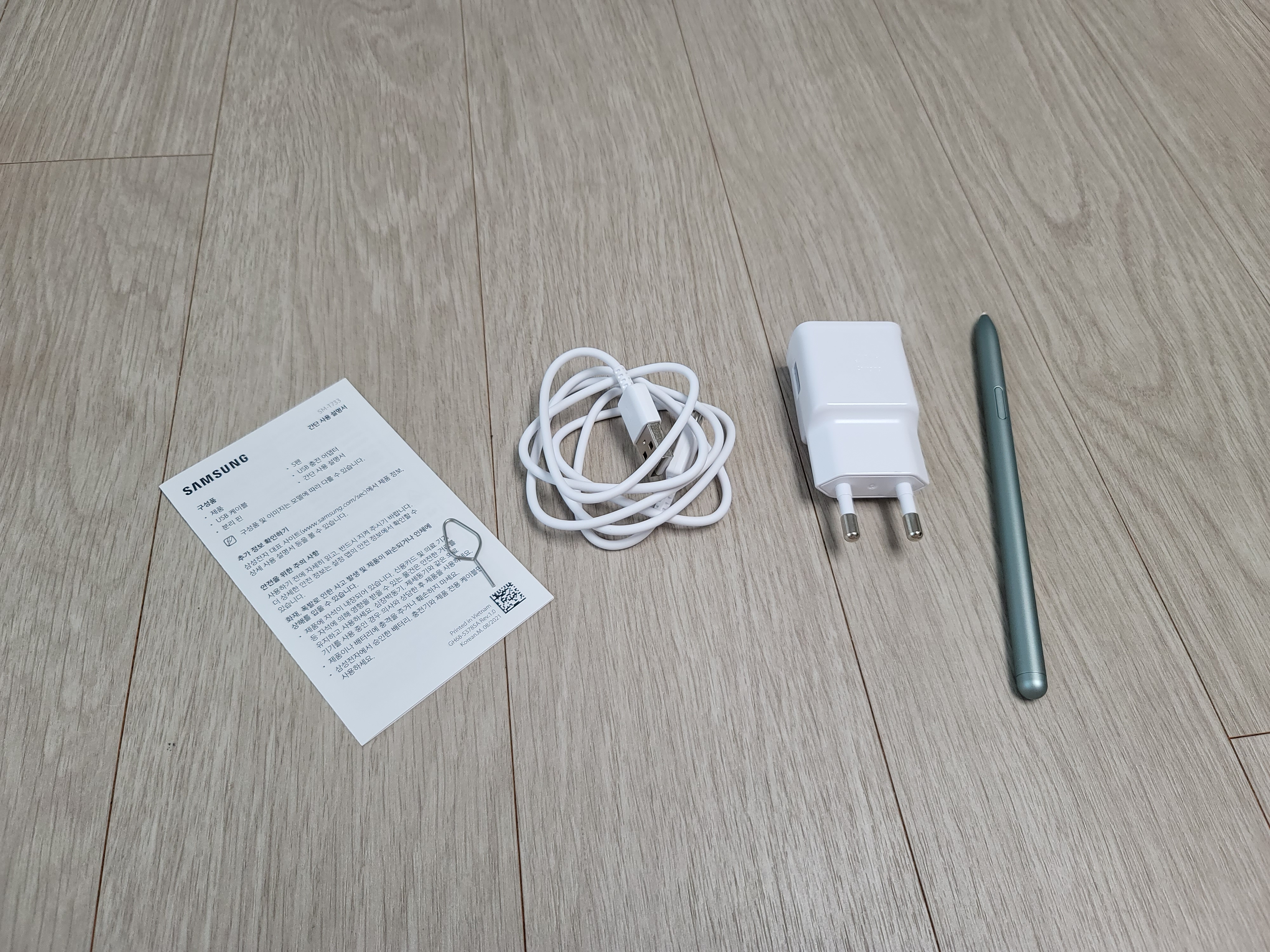 갤럭시 탭 본채는 나중에 살펴보고 우선 구성품 먼저 보시면 미스틱 그린 색상의 S펜, 간단 사용 설명서, USB-A to C 충전기와 어댑터, 분리 핀이 동봉되어 있습니다.