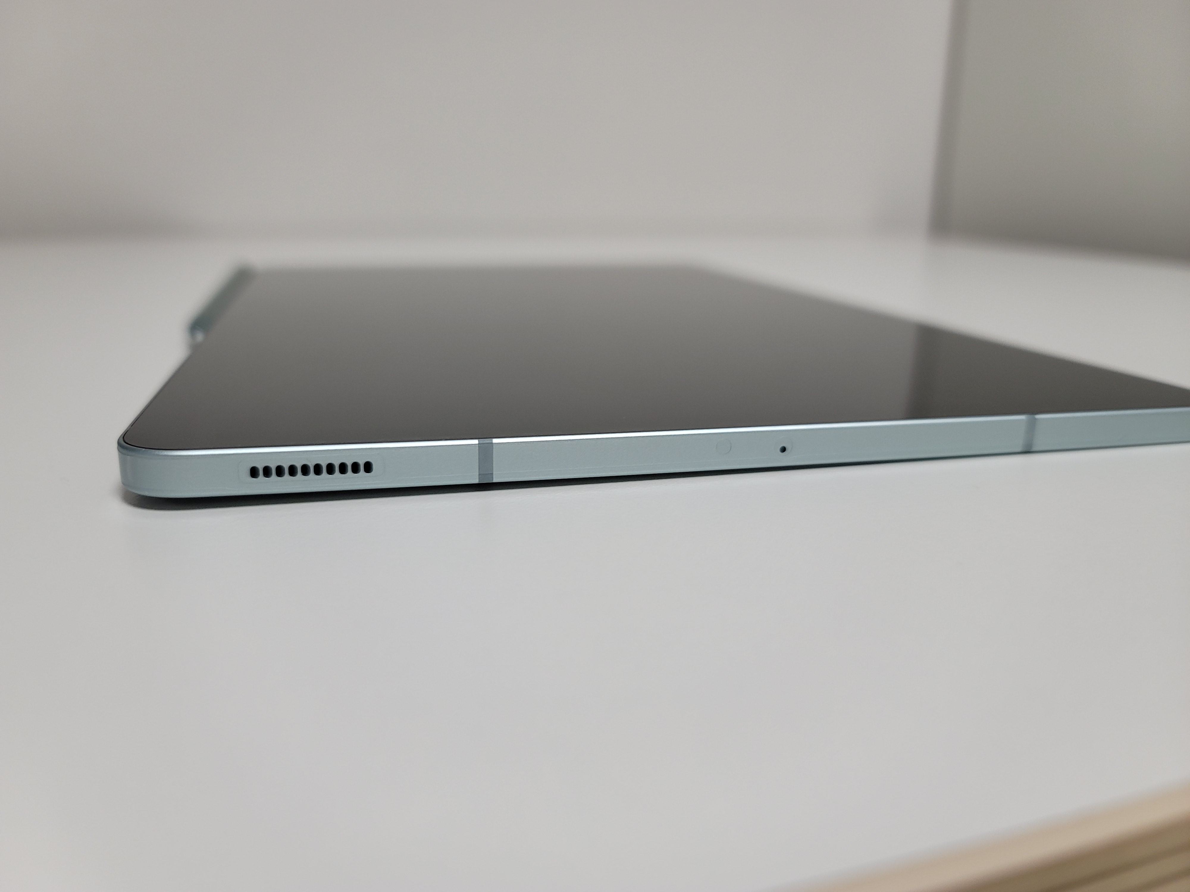 갤럭시 탭의 측면에는 USB-C 단자, 스테레오 스피커가 있습니다.